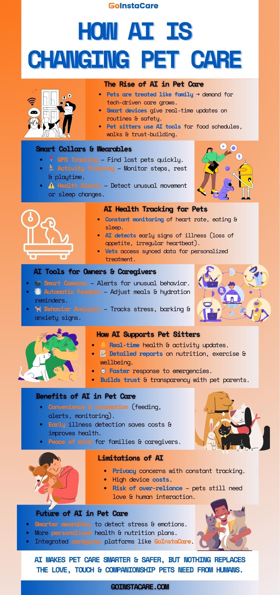 AI tools can transform people to take care of their pets by delivering them information, keeping track of their activities, and monitoring their health. This helps families to keep their pets safe and healthy. But technology can't deliver the emotional support and companionship that human caregivers can provide. Families can keep their pets safe and healthy by using technology. GoInstaCare has pet care services that offer trustworthy caregivers who can use AI.