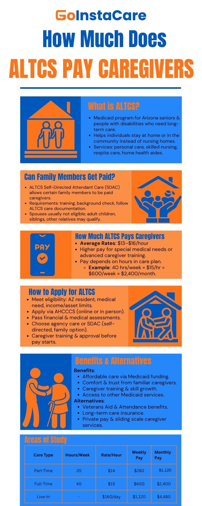 ALTCS is a good option for Arizona families who desire long-term care but want to save money. Knowing how much ALTCS pays caregivers and who can get it makes it easier to plan and make wise choices. This program gives you options, whether you're a family caregiver who wants to get paid for your work or someone who wants to employ a good provider. You can choose between agency-based care and self-directed care. Getting the correct information can help everyone involved in the growing need for in-home care get better results. Use GoInstaCare to find ALTCS-friendly, professional caregivers right now. You'll get reliable, caring, and personalised help.