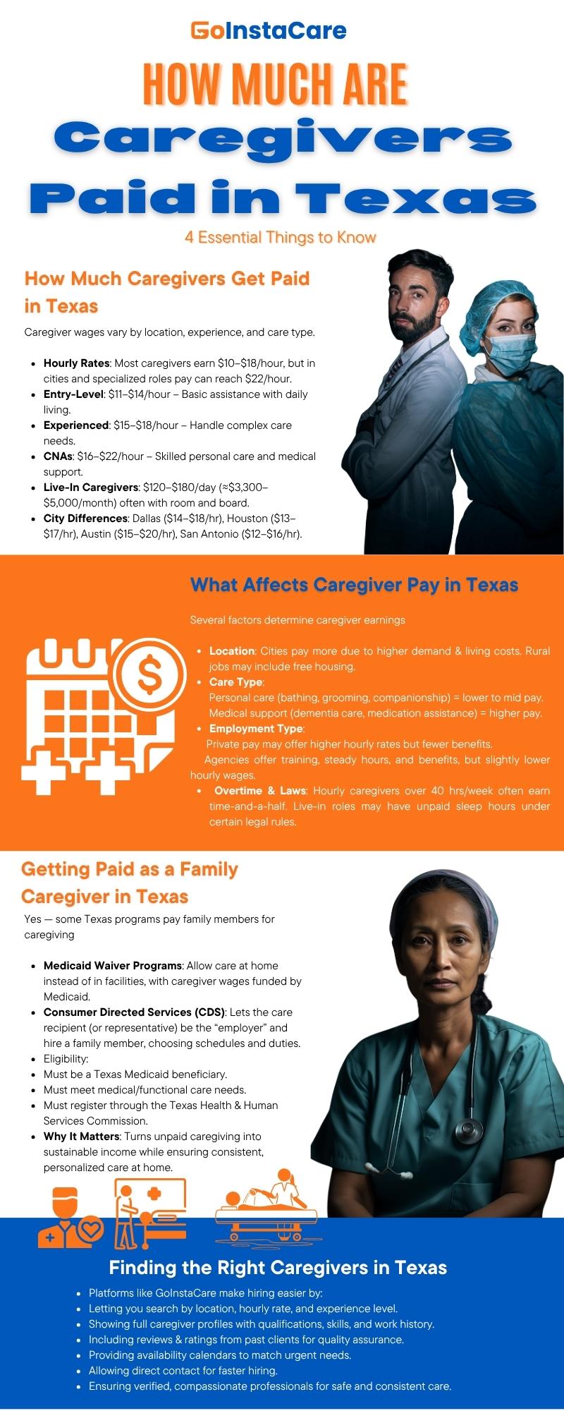 In Texas, caregiver compensation varies considerably based on the city, the type of care, and the caregiver's experience level. Knowing these rates enables caregivers to advocate for reasonable compensation and assists families in setting realistic budgets. GoInstaCare is a helpful way for everyone who needs reliable aid to get in touch with skilled professionals at a price they can afford. Families can be sure to find the perfect match because of the detailed profiles, verified reviews, and instant connection options. Using a trustworthy platform makes the process easier and ensures that your loved ones get good care at fair, open costs, whether you need live-in help, hourly help, or specialized care.