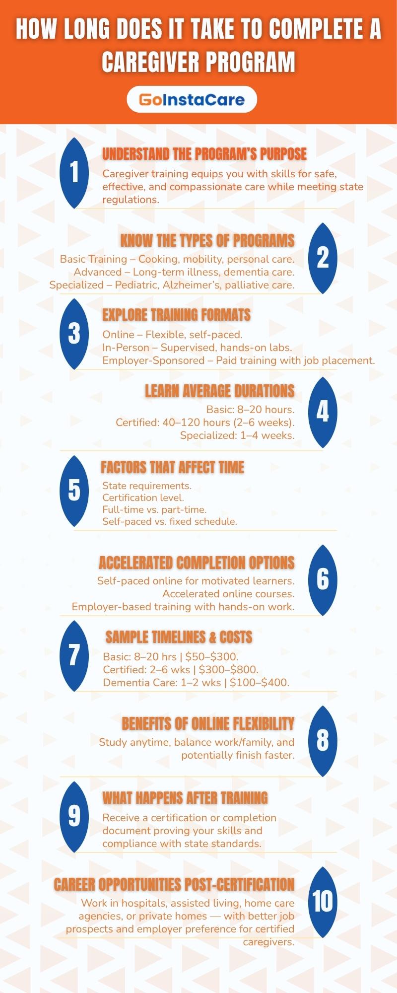 If you choose an expedited or basic curriculum, especially one available online, you can finish your caregiver training in less than a week. However, advanced or authorized courses usually take longer since they have to fulfill state and skill standards.