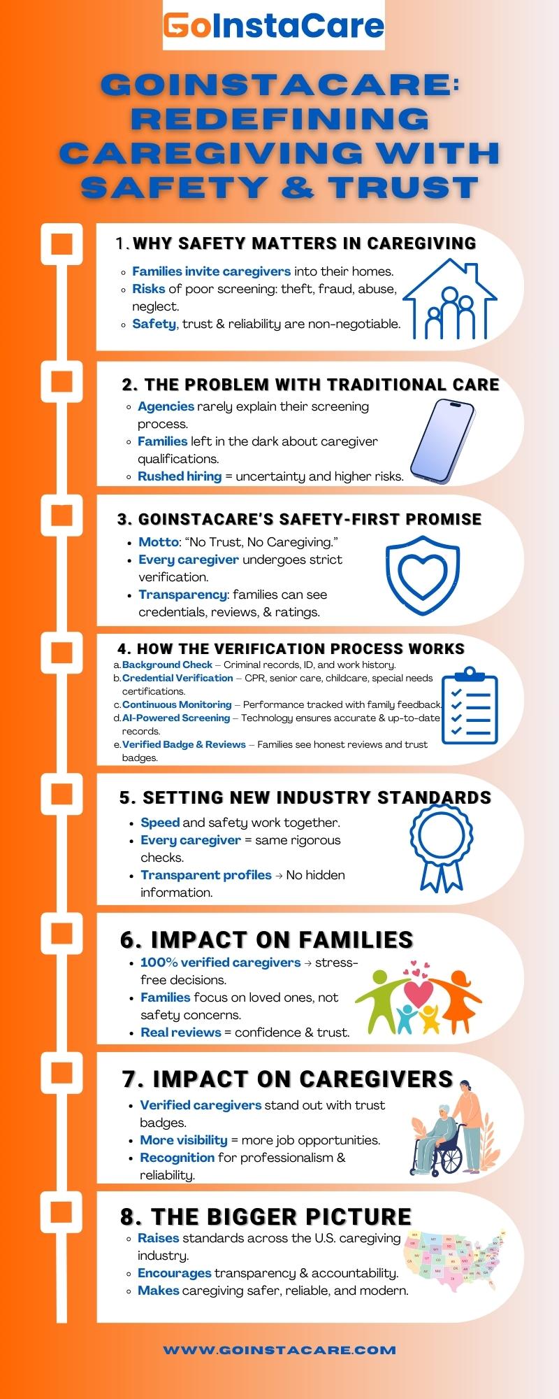 GoInstaCare is a tech-based service for caregivers that states that safety is the most important thing in any care collaboration. Its main goal is to provide safe, reliable, and affordable care with safety. GoInstaCare's motto is "No trust, no caregiving." Families may only feel safe when they know that caregivers have been completely verified homes.
