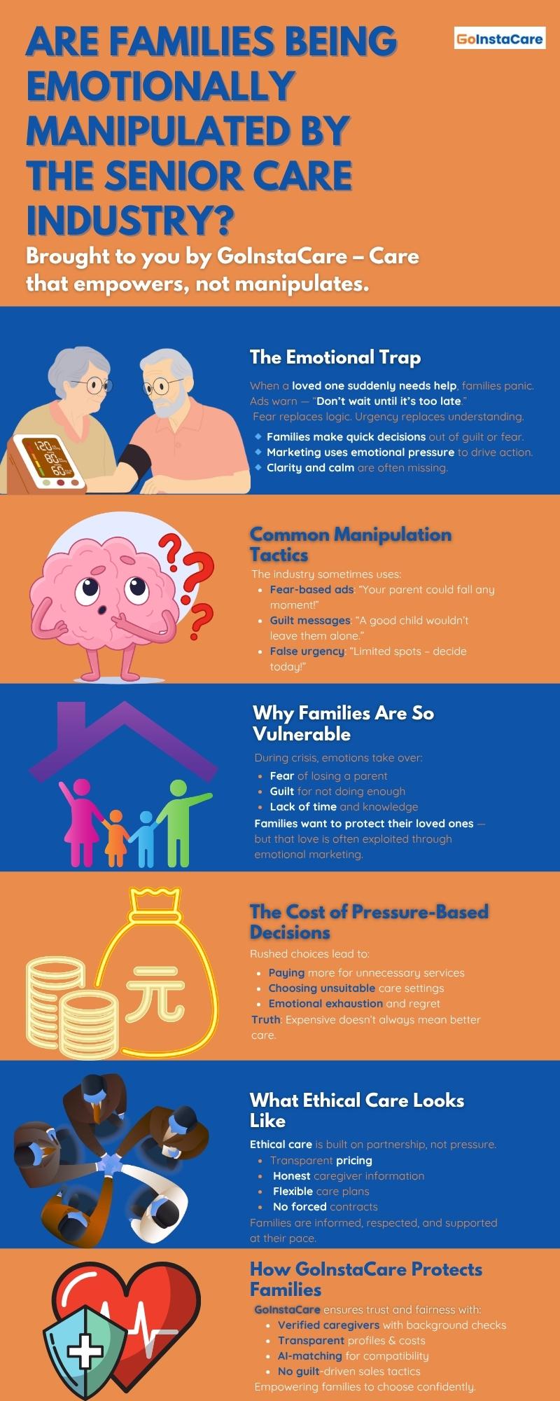 When marketing for senior care, they often play on our strongest feelings, such as love and fear of losing someone. The purpose may seem selfless, but it's not right to use these impulses to force families to make decisions they don't fully understand. Urgency takes the place of clarity. Assurance takes the place of transparency. Families should get more moral care that teaches them, instead of forcing them to do things. GoInstaCare caregivers stand out in this way by pushing for reliable, affordable, and clear care, which makes families feel supported instead of pressured.