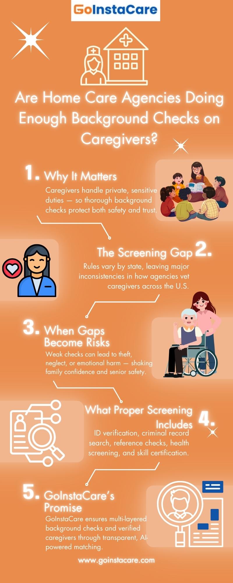 The rules for screening caregivers are very different in different parts of the US. Some states require background checks to be done with fingerprints, while others leave it up to the agency to decide. Because of this difference, a caregiver who has been cleared in one state may not pass in another. Because they don't have enough staff, smaller or less regulated agencies may skip over thorough verification steps and only check criminal records, leaving out job history and identification verification. Families are left wondering who is coming into their homes, which makes their safety net less stable. It's often a lack of national control, not negligence. But the end consequence is care settings that are less safe and confidence that is actually damaged.