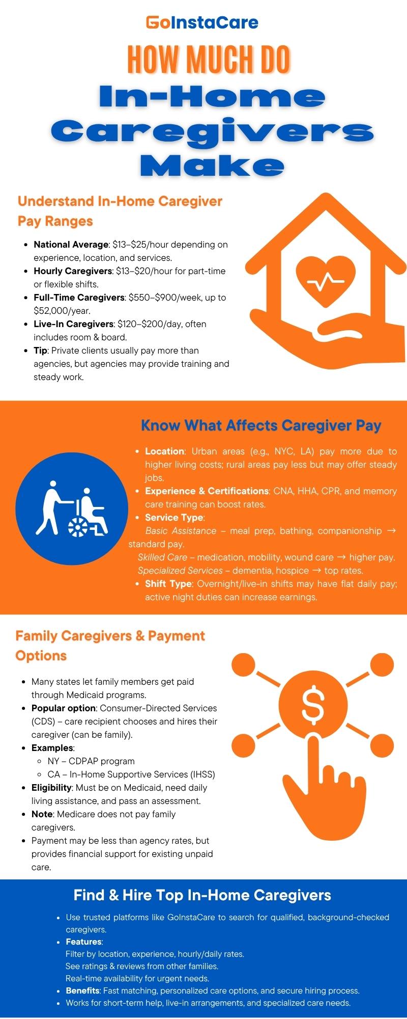 The pay for an in-home caregiver depends on where they work, their experience, what kind of care they deliver, and how their shifts are set up. Generally, pay is higher in cities and for specialised care jobs than in rural areas or basic aid.