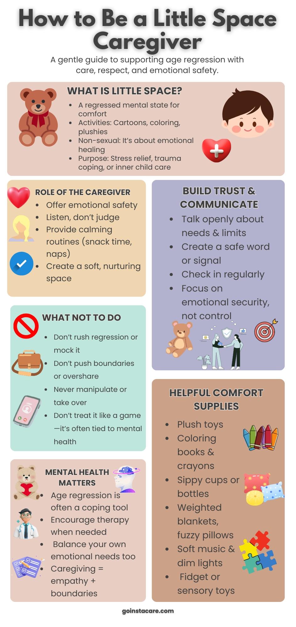 Little space care is when you help someone who is acting like a child, which might happen as part of age regression for emotional safety or rehabilitation. You should be very careful, ask for permission, and show respect in this region. Whether you are a friend, spouse, or new caregiver, your role is to respond gently, set clear boundaries, and offer comfort. Age regression isn't a game; it's often linked to mental health or emotional management. The first stages to being a small space caregiver are to listen, recognize triggers, and express love without judging or pushing someone to grow up or act appropriately.