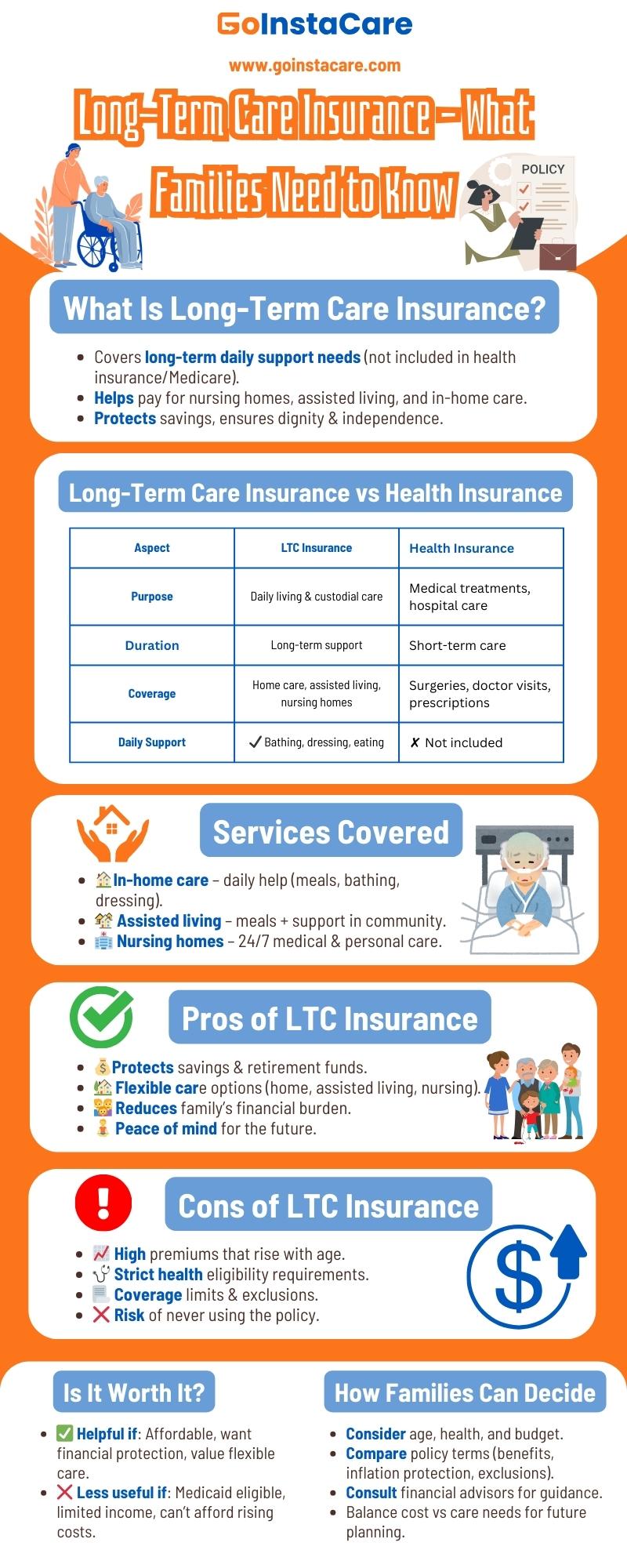 Long-term care insurance helps pay for the high costs of services like assisted living, nursing homes, or in-home care that regular health insurance and Medicare often don't cover. Families usually have pros and cons of long-term care insurance before choosing. To plan for becoming older or having health problems, you need to know how it works and its pros and cons. Families can help them to make wise choices that have equal balance to their need for care and financial stability.