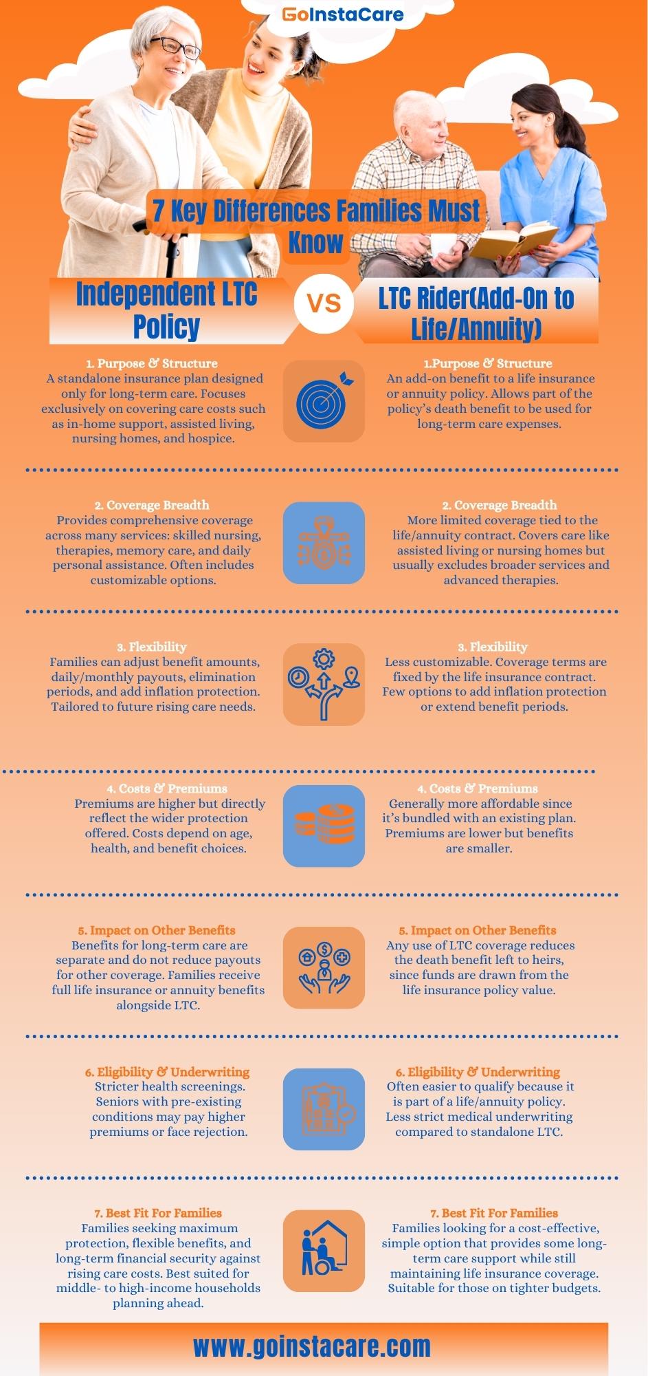 Families that offer safety and value when they compare LTC coverage. An independent long-term care policy is an individual plan that only pays for long-term care costs, like nursing homes, assisted living facilities, or aid at home. An LTC rider is an extra benefit that can be added to a life insurance or annuity policy. If you need care, you can use part of the benefit to pay for it. Each plan's pros and cons are cost, flexibility, and coverage limits. Families may choose the best option for long-term care planning and financial security.