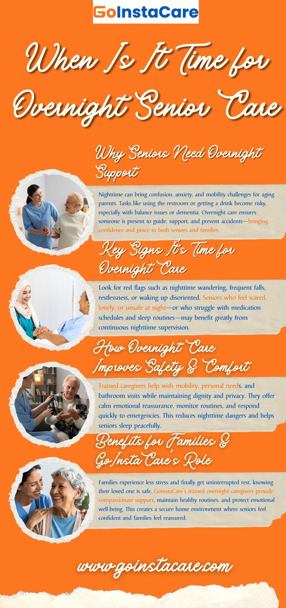 When families hire overnight caregivers, they can rest easy knowing that their loved ones are safe. GoInstaCare guarantees that seniors will be cared with empathy and respect. This will make a safe atmosphere where seniors can thrive and families can get their emotional wellness. This is an established approach in modern times that encourages nighttime care.