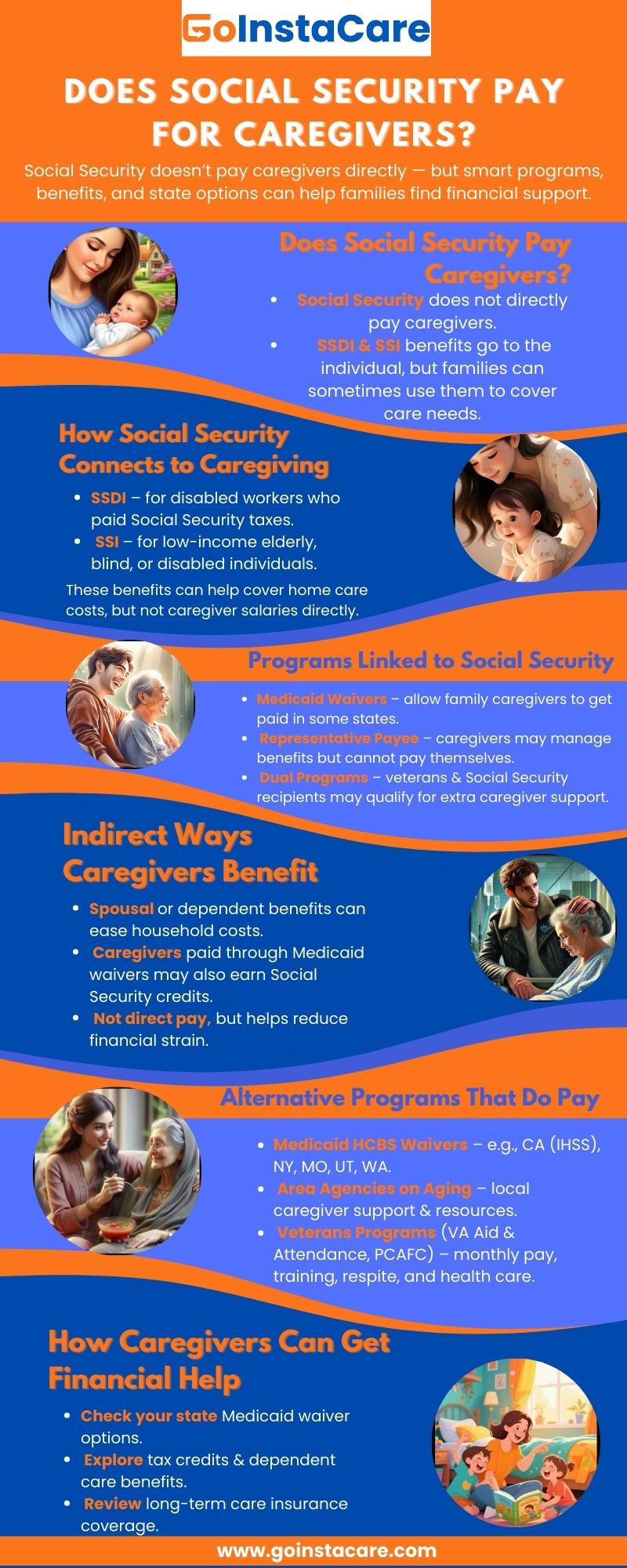 Medicaid waivers and veterans benefits are two programs that may help caregivers with money, even though Social Security doesn't pay them directly. You should contact your local Medicaid office to find out if you can qualify. GoInstaCare connects families with verified and secured caregivers so they may get trustworthy support. This gives you peace of mind that your loved ones will get high-quality care.